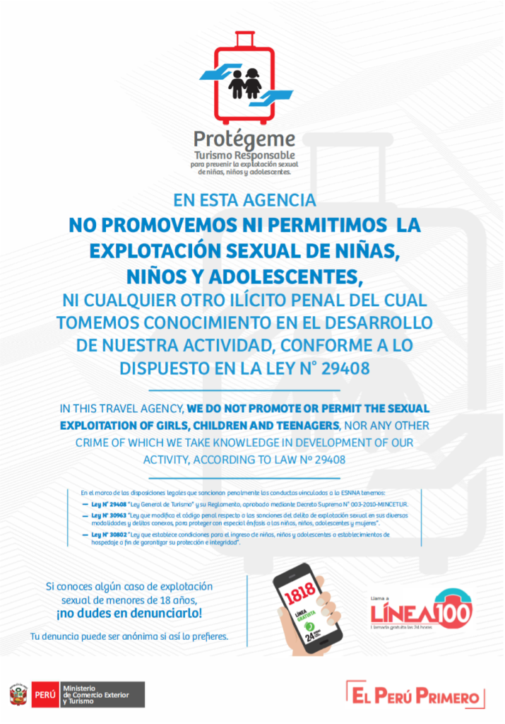 En esta agencia no promovemos ni permitimos la explotación sexual de niños, niñas y adolescentes; ni cualquier otro ilícito penal del cual tomemos conocimiento en el desarrollo de nuestra actividad conforme dispuesto en la ley N° 29408.